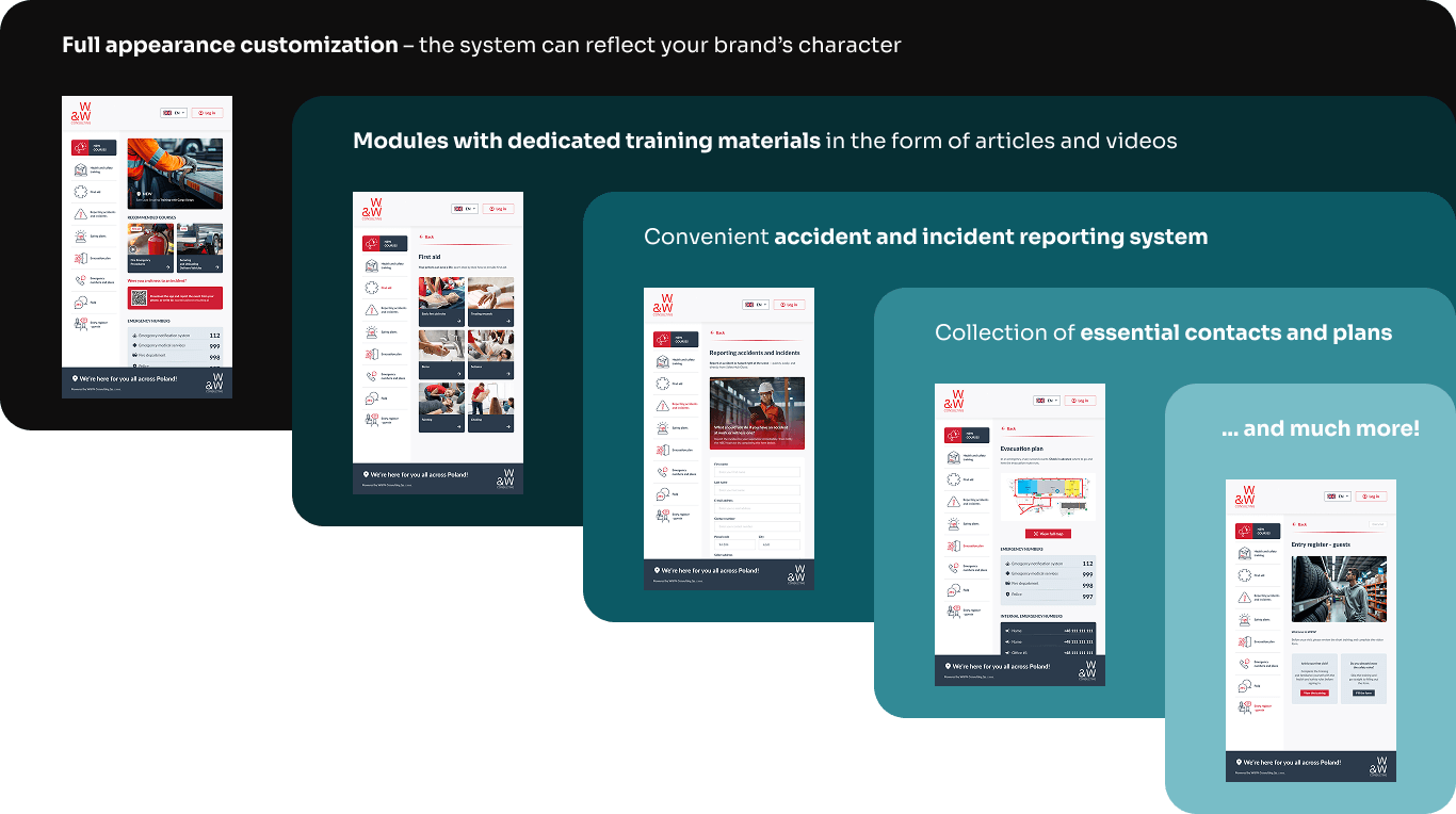Forget long blocks of text. Instead, enjoy clear educational materials, videos, animations, and checklists — all through an intuitive interface. Access everything in multiple languages, including digital evacuation plans, trainings, and emergency contacts. It’s safety without language barriers.